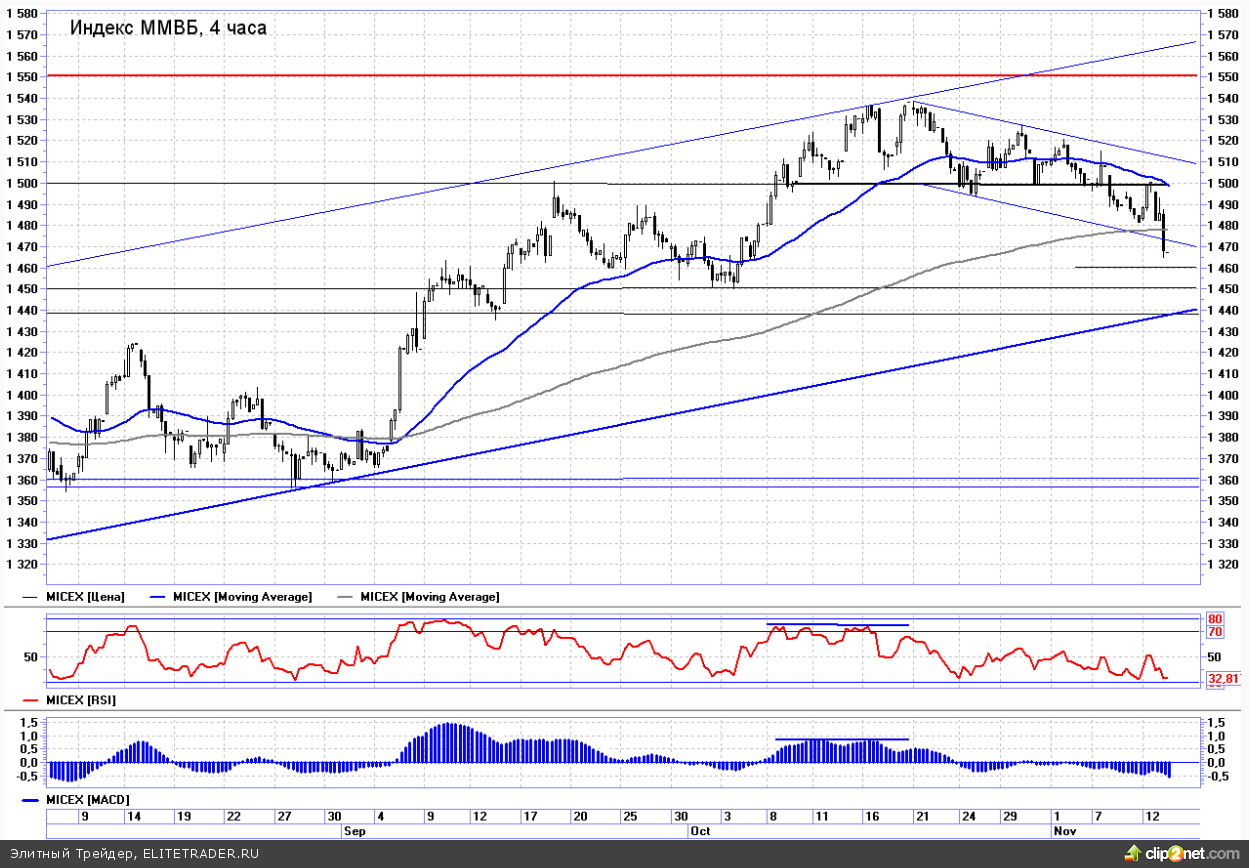 Российский рынок завершил торговую сессию среды сильным снижением. При этом ММВБ резко ушел ниже уровня 1480 и теперь ближайшей поддержкой становится диапазон между 1450 и 1460. Уйти ниже данных уровней без дополнительных драйверов будет крайне сложно. Поэтому в скором времени вполне вероятно мы увидим тест уровня 1480, где теперь проходит сильнейшее сопротивление виде трендовой линии.