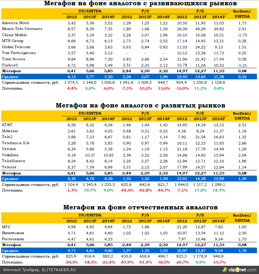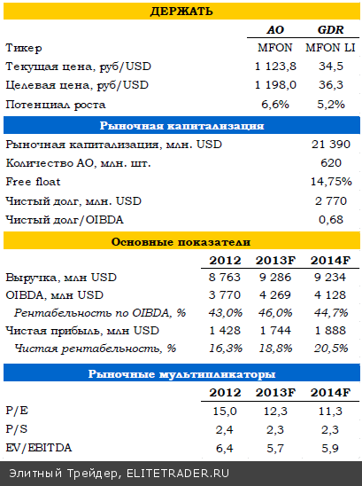С учетом опубликованных результатов, мы немного повысили прогноз по выручке и OIBDA на 2013 год, а также пересмотрели ожидания по росту сегментов передачи данных и продажи оборудования на ближайшие годы. Согласно обновленной модели, справедливая стоимость бумаг Мегафона на конец 2014 года составляет 1198,0 рублей за обыкновенную акцию и $36,3 за GDR.