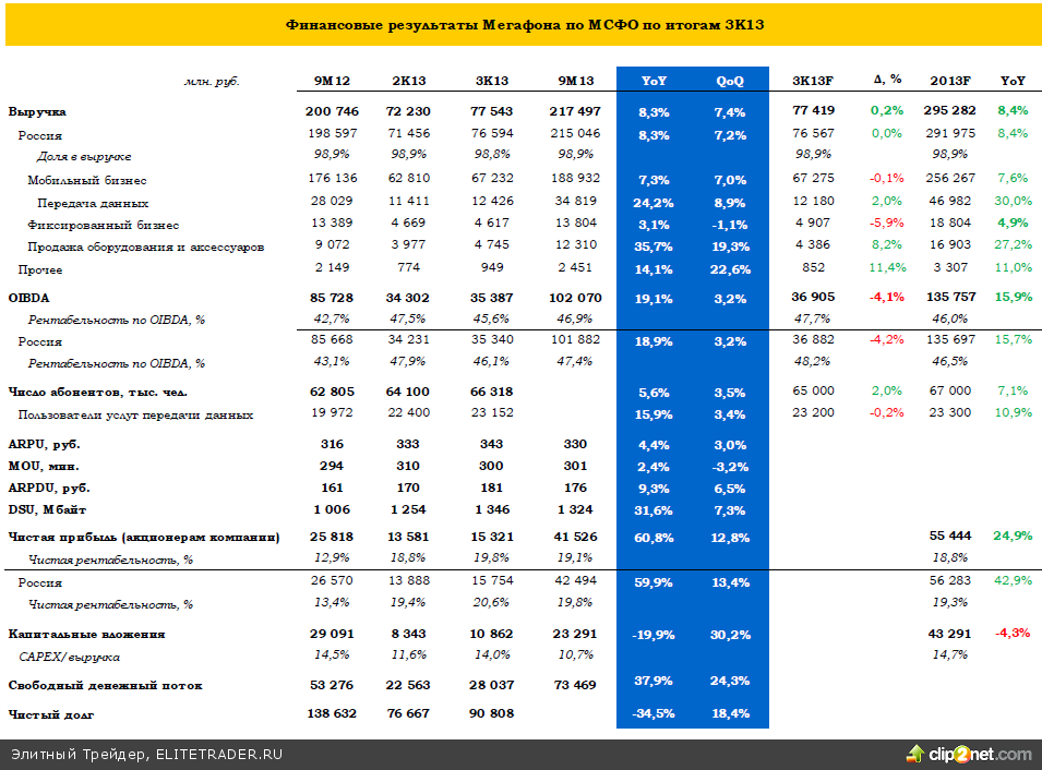 Рентабельность по OIBDA выросла с 42,7% (за 9М12) до 46,9% (за 9М13);