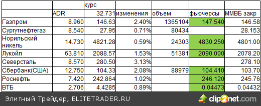 ADR в США 14.11 (Северсталь, Роснефть, ВТБ в Лондоне ) и закрытие вечерних фьючерсов в России Цветами (или знаками +-) далее изображен характер разницы по сравнению с закрытием вечерних фьючерсов ночью накануне. Евро/доллар))1.3454 в 7.58 пятницы))1.3465 в 7.53 четверга )01.3443 в 8.02 среды ))1.34 в 7.54 во вторник )