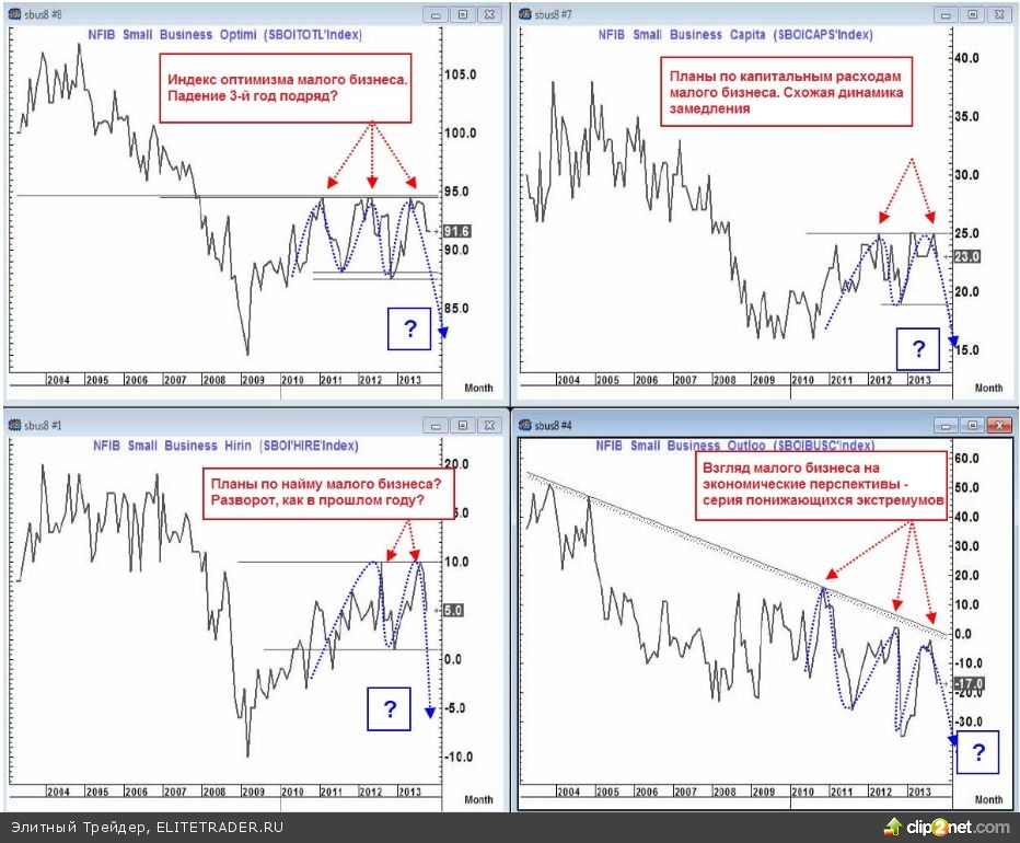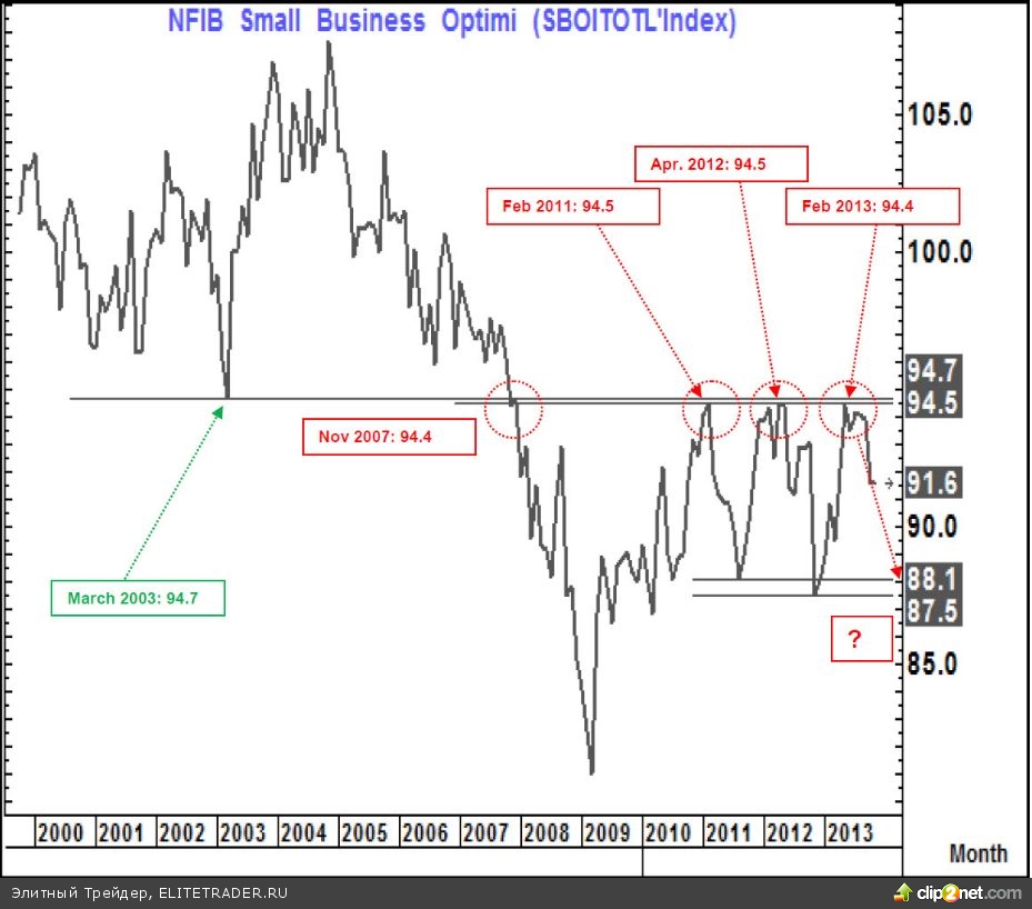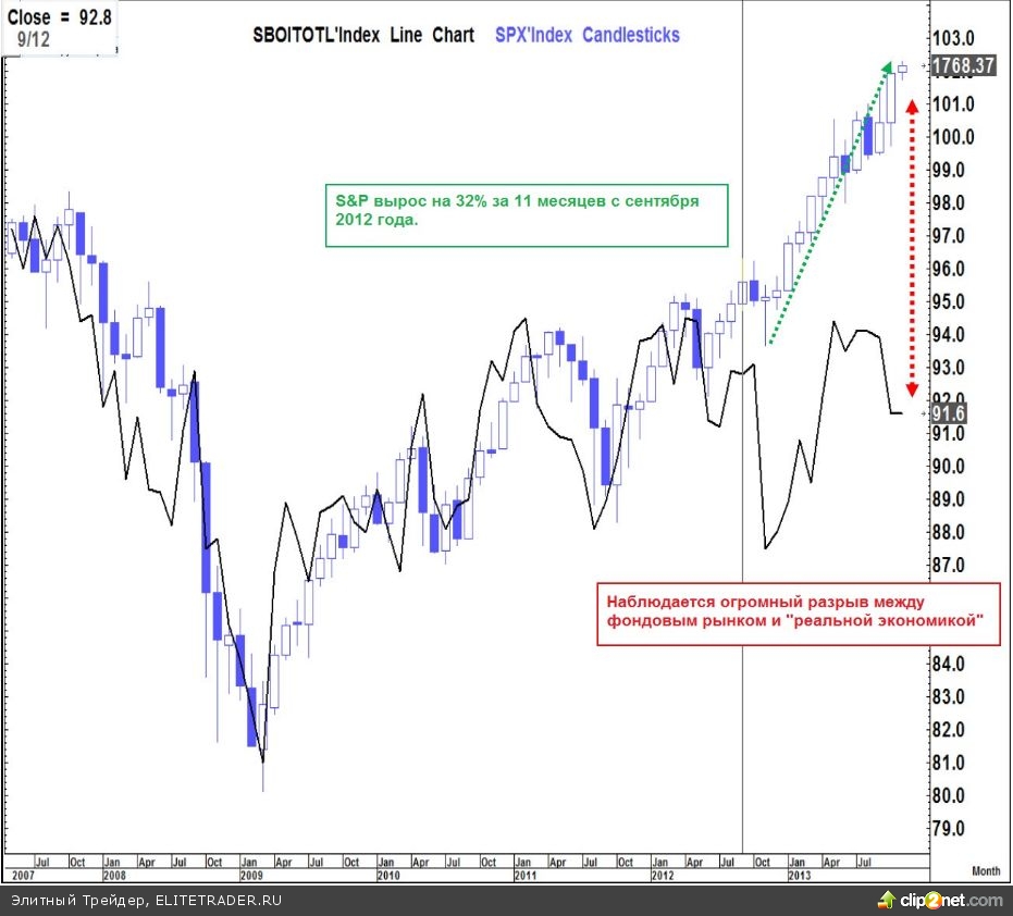 Тем не менее, с сентября 2012 года, когда ФРС перешла в режим «QE-бесконечность» появилось огромное расхождение между этими двумя индикаторами. Если бизнес показатели продолжат ухудшаться, как мы ожидаем, то, скорее всего, неизбежно формирование отрицательной обратной связи с реальным сектором экономики, что в конечном итоге скажется на создании новых рабочих мест, которое на данный момент остается качественно слабым.