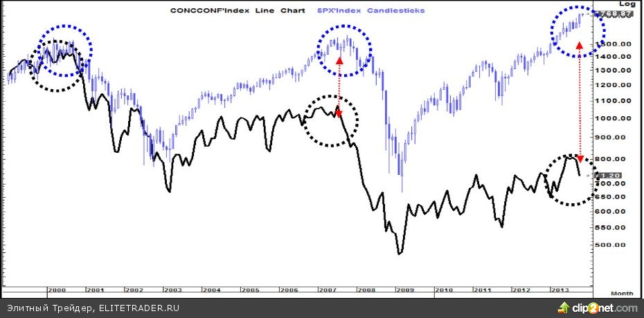В 2000 отставание S&P от потребительского доверия составляло 4 месяца – доверие достигало максимумов, начинало снижаться, а через 4 месяца вслед за ним следовал S&P. В 2007 году отставание составило 3 месяца. Сейчас мы наблюдаем 4-х месячное отставание (потребительское доверие достигло своего пика в июне, а S&P до сих пор продолжает расти).