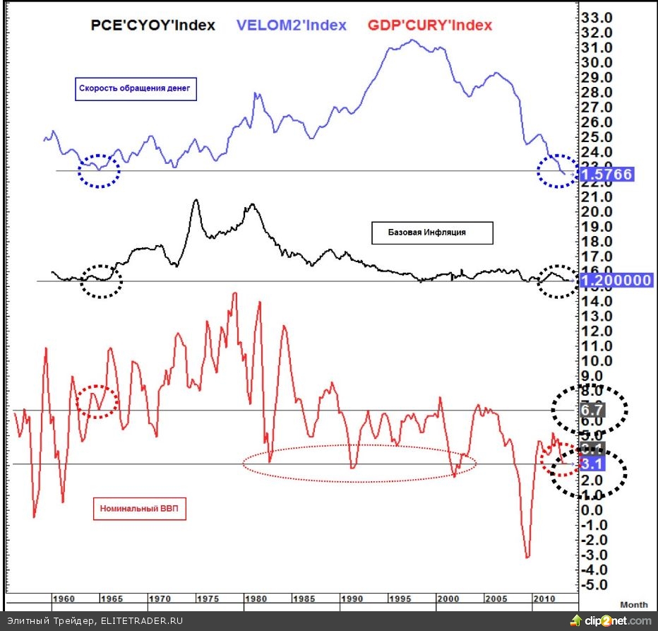 Падение скорости обращения денег приводит к нерегулярности экономического роста, что приводит к нерегулярности создания новых рабочих мест, что в свою очередь приводит к понижательному давлению на инфляцию – к дефляции. Мы утверждаем, что QE стимулирует чрезмерное нерациональное использование капитала на финансовых рынки и тем самым напрямую способствует снижению/сокращения скорости обращения денег.
