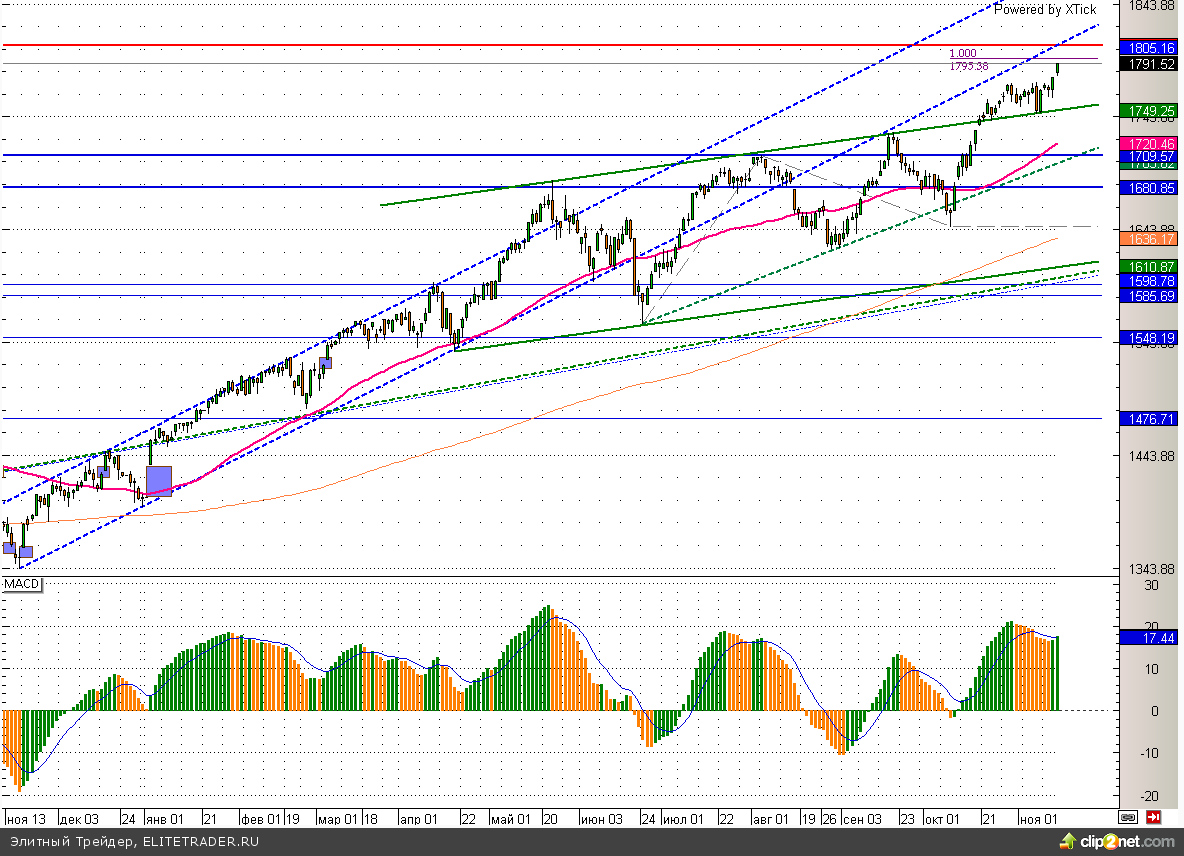 Индекс S&P500 продолжает свой невероятный рост последних месяцев и уже практически подобрался к отметке 1800, где его ждет очень сильное сопротивление. На данном уровне сейчас проходит нижняя линия восходящего канала, преодолеть которую без дополнительных драйвером будет не просто. Поэтому есть вероятность в ближайшее время увидеть начало коррекции на американском фондовом рынке, особенно учитывая появившуюся дивергенцию между MACD гистограммой и ценой, а также предстоящее на следующую на следующей недели публикацию протоколов ФРС.