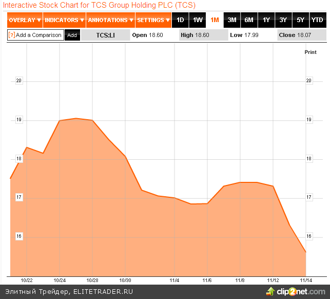 К 16:45 мск одна депозитарная расписка TCS Group на LSE стоит $10,64, что на 32% ниже уровня закрытия торгов накануне. На прошедшем в конце октября IPO ценные бумаги были проданы инвесторам по $17,5.