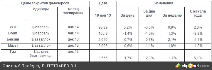 Цены на энергоносители за прошедший день дружно снизились. Очень выразительным было снижение цен на европейскую нефть марки Brent. Исключением стала нефть марки WTI в США, которая закончила день вблизи нулевых отметок. Продолжавшееся без малого три месяца снижение цен нефти в США создало ситуацию локальной перепроданности. На фьючерсных рынках там поддерживается ситуация контанго и цены дальних фьючерсов устанавливаются выше, чем цены фьючерса с погашением в январе. Так, цена фьючерса на баррель нефти с погашением в апреле на 0,23 доллара дороже, чем фьючерса с погашением в январе. По нефти марки Brent сохраняется беквордация и цена апрельского фьючерса на процент ниже, чем цена январского фьючерса. Разница цен нефти по обе стороны Атлантики на 20 ноября составляет 13 долларов за баррель.