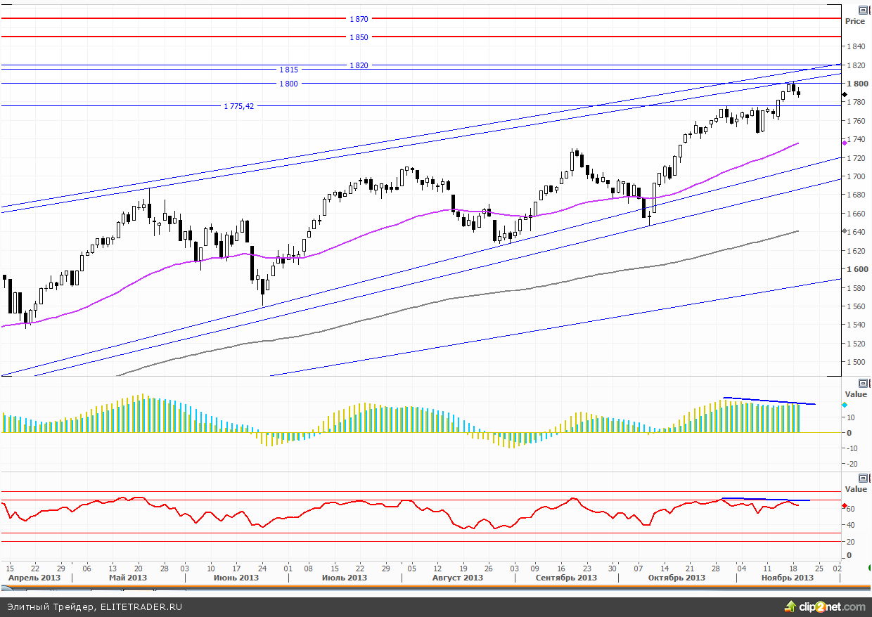 Индекс широкого рынка S&P500 отступает второй день подряд после того, в начале недели, обновив исторические максимумы, он превысил отметку 1800 пунктов. Правда отступление это весьма скромное, в частности вчера потери составили всего 0,2%. Настоящего развития коррекции еще не было, и во многом оно может зависеть от сегодняшнего дня, когда на суд инвесторов будут предоставлены данные по индексу потребительских цен, розничным продажам, и конечно информация из протоколов октябрьского заседания ФРС.