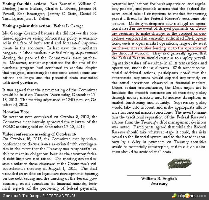 Ясно осознавая, что от безответственных политиков в конгрессе всего можно ожидать, Федрезерв в своих минутках совершенно четко дает понять, что дефолт Америки никак не отразится на покупках Федрезервом активов.