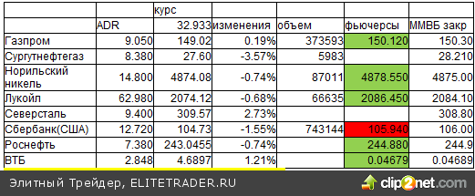 Российские ADR в Нью-Йорке упали (индекс Блумберга) на -1.34%. Упали Ростелеком (-3.85%), Сургутоб(-3.57%), Сбербанк(-1.55%), Русгидро (-1.27%), Сургутпреф (-1.09%), МТС (-1.03%), Мечел (-0.87%), Норникель (-0.74%) Лукойл (-0.68%). Market Vectors Russia ETF упал -1.19%.