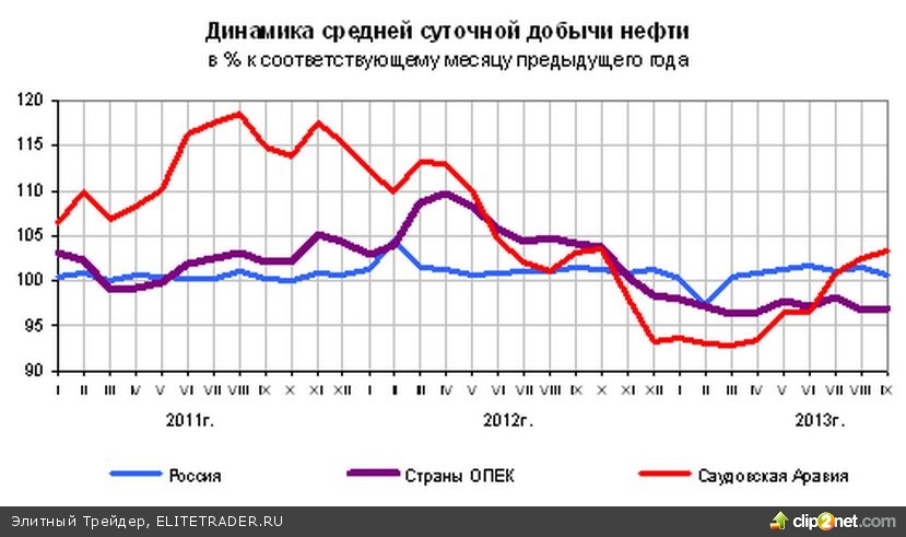 По вышедшим данным Росстата Саудовская Аравия по итогам сентября обогнала Россию по объемам добычи нефти. Россия в сентябре добывала 9,987 миллиона баррелей в сутки, тогда как Саудовская Аравия –10,061 миллиона баррелей в сутки. Экспорт нефти из России в январе-сентябре 2013 года снизился на 1,3% по сравнению с аналогичным периодом 2012 года - до 175,4 миллиона тонн. Удельный вес нефти в общем объеме российского экспорта за девять месяцев текущего года составил 33,2%.