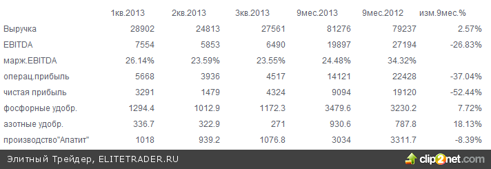 Компания ФосАгро отчиталась за 9 месяцев 2013г. по МСФО. Из-за ухудшения условий на рынке удобрений ее показатели ухудшились по сравнению с 9 месяцами 2012г. Хотя выручка подросла на 2.6%, EBITDA снизилась на 26.8%, а операционная прибыль снизилась на 37%. Между тем третий квартал преподнес приятный сюрприз. Несмотря на снижение мировых цен на удобрения, финансовые результаты во втором полугодии улучшились.