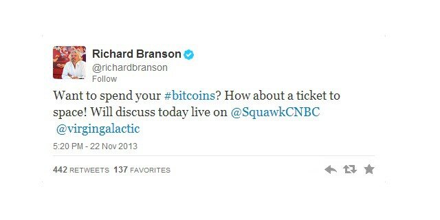 В последовавшем интервью телеканалу CNBC Брэнсон подтвердил, что компания Virgin Galactic уже продала билет на один из рейсов SpaceShipTwo за bitcoin.