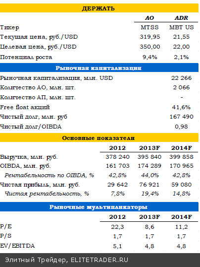 С учетом пересмотра прогнозов по финансовым результатам оператора на ближайшие годы, мы обновили модель оценки стоимости акций компании. Мы повышаем целевой уровень на конец 2014 года до 350 рублей за обыкновенную акцию ($22,0 за ADR).