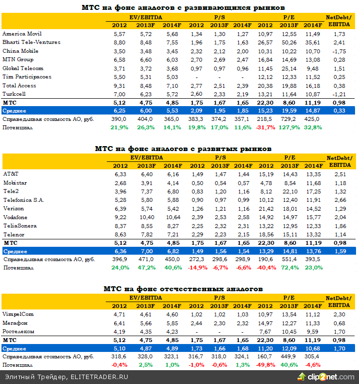 Относительно аналогов с развитых и развивающихся рынков МТС смотрится дешево (что объясняется меньшими размерами бизнеса), а вот в сравнении с российскими конкурентами компания оценена вполне справедливо. Возникший в последние месяцы дисконт к ВымпелКому (акции которого сильно выросли в цене за счет смены биржи и включения их в индекс NA