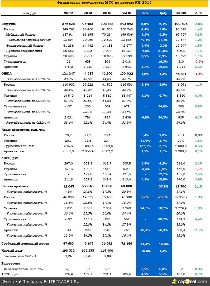 В основном для оператора российском бизнесе (на него приходится около 90% от общей выручки) в третьем квартале наблюдалась положительная динамика практически во всех операционных сегментах. Третий квартал – традиционно лучшее время года для сотовых операторов «большой тройки», характеризующееся самыми высокими показателями ARPU и MOU. Одновременно с этим, по итогам квартала существенный рост показала и абонентская база оператора: на 3,4% относительно 3К12 до 73,1 млн человек.
