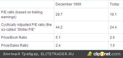 Тем не менее, трезвая оценка данных показывает, что рынок сегодня менее перегрет, чем это было в декабре 1999 года. Для подтверждения этой мысли MarketWatch публикует таблицу, в которой сравниваются несколько показателей – сегодня и 13 лет назад.