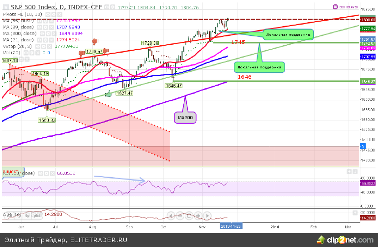 Хотя индекс и преодолел рубеж 1800, RSI находится ниже 70+, что оставляет потенциал движения выше. Многие технические показатели констатируют перегретость рынка, но психология толпы толкает рынок выше и возможно не без участия игроков в короткую, которым приходится закрываться.