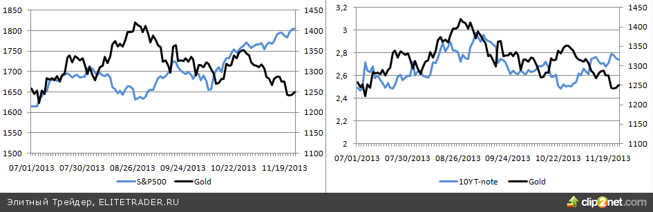 Последний раз обратная взаимосвязь драгоценного металла и фондовых индексов была зафиксирована в августе, когда в центре внимания инвесторов находился сирийский вопрос. В целом же активы позитивно воспринимали информацию о продолжении американского QE. Нынче же их пути разошлись. На мой взгляд, дело в словах Йеллен, утверждающей, что на рынке акций США нет пузыря. Вдохновленные покупатели толкнули S&P500 к новым историческим максимумам, золото же оказалось более осторожным: инвесторы закладывают в котировки вероятность сворачивания программы покупок облигаций. Этот фактор способен коренным образом изменить ситуацию даже в том случае, если масштаб QE будет уменьшен. Полагаю, что ключевым событием для рынка золота станет публикация данных об американском рынке труда. Ждать осталось недолго, поэтому рекомендую инвесторам сосредоточиться на внутредневной торговле и не спешить с открытием среднесрочных позиций. Сопротивление находится в области $1255-1260 за унцию, его удачный тест способен активизировать покупателей, неудачный, наоборот, приведет к продолжению нисходящего движения