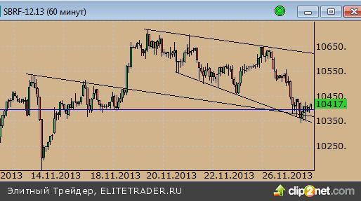Продолжается консолидация вблизи осенних максимумов. В результате вчерашней коррекции на часовом графике котировки опустились к поддержке, образованной горизонтальным и двумя диагональными уровнями спроса, где покупатели начали проявлять сопротивление снижению. Таким образом, напрашивается отскок внутрь сформированного нисходящего канала.