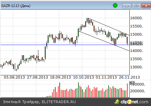 Цены торгуются в рамках осеннего нисходящего канала. В настоящее время котировки достигли горизонтального уровня спроса, которым выступает минимум предыдущей волны снижения вблизи отметки 14400 пунктов. Технически отскок с текущих уровней позволит ценам консолидироваться между текущей поддержкой и верхней границей канала. Пробой вчерашних минимумов даст толчок к движению фьючерса в район отметки 14000 пунктов.