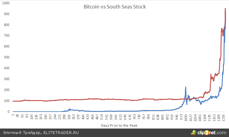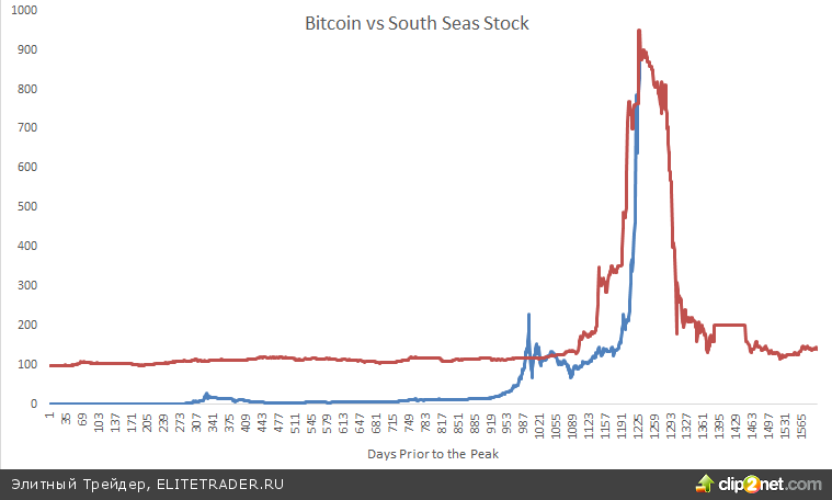 Business Insider приводит сравнительный график электронной валюты bitcoin и акций Компании Южных морей – «just for fun». Напомним, в начале 18 века акции фирмы подскочили со 100 до 1000 фунтов, а потом вновь обрушилась, вызвав череду банкротств. Пишут даже, что на этом «погорел» сэр Исаак Ньютон, который, потеряв 20 000 фунтов, заявил, что может вычислять движение небесных тел, но не степень безумия толпы. Автор колонки отмечает сходство этих графиков, но отмечает, что у него нет ни малейшего представления, обрушится ли биткоин вообще и когда это произойдет. Он просто предлагает подумать над этим.