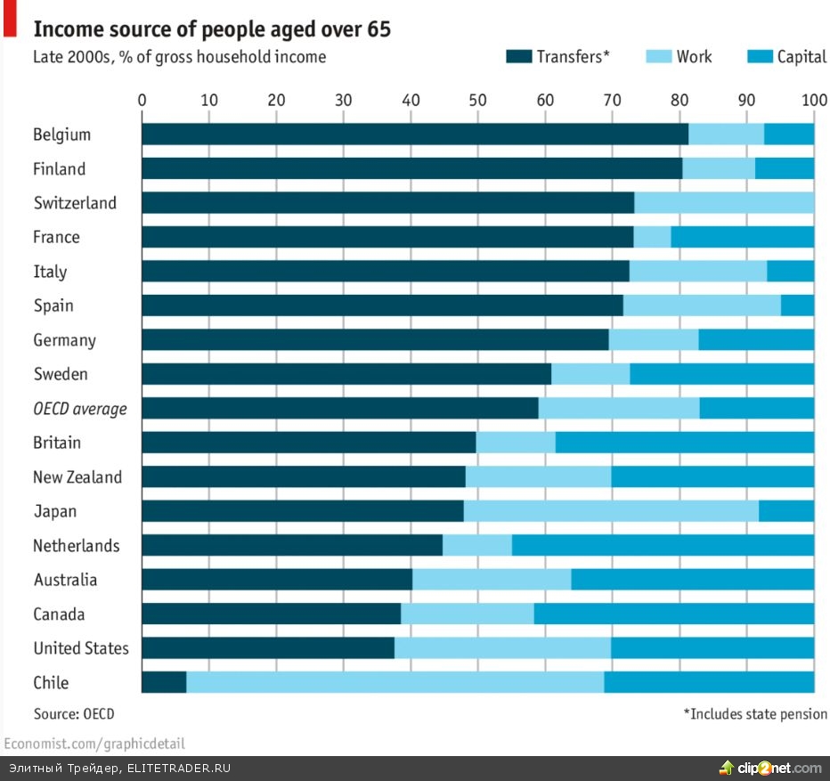 Пенсионеры в большинстве стран зависят от госказны. Однако в странах ОЭСР доля социальных отчислений в среднем составляет менее 60% общего дохода людей старше 65 лет, при этом 25% приходится на собственный заработок, остальное – на накопленный капитал, демонстрирует на своем графике The Economist. Больше всего от государства зависят пенсионеры в Европе, причем в Бельгии и Финляндии пенсии составляют более 80% доходов. При этом в Чили обратная ситуация: страна в 1981 году перешла на систему частного финансирования пенсий. Данных по России на графике нет, однако Slon.ru ссылается на прошлогоднее исследование РАН, в котором обозначено, что от государства российские пенсионеры получают около половины своего дохода, остальное приходится на подработку, сдачу жилья или земли в аренду, ведение подсобного хозяйства и т.д.