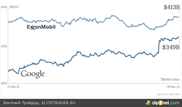 Станет ли Google в скором времени дороже Exxon Mobil, задается вопросом Пол Р. Ла Моника, автор колонки на CNN. Сейчас рыночная стоимость интернет-компании составляет около $350 млрд – это третья по рыночной стоимости компания в США. В начале этого года Google обошел Microsoft и сейчас догоняет Exxon, которая стоит около $415 млрд. И хотя расстояние в $65 млрд не выглядит маленьким, график показывает, что интернет-гиганту под силу его преодолеть: в нынешнем году акции компании выросли почти на 50%, в то время как Exxon прибавили лишь 9%.
