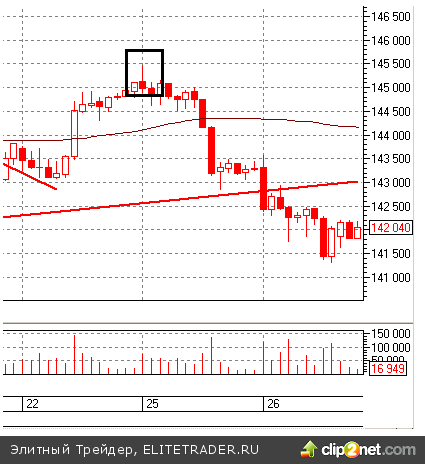 Утренний микроимпульс в 10-30 был очень агрессивен и резок. В течение 1 минуты фьючерс прошел 600 пунктов, что для текущей волатильности является весьма приличной величиной. Теперь границы этого импульса будут являться основным краткосрочным сопротивлением (импульс начался от 143 000-143 500 пунктов).