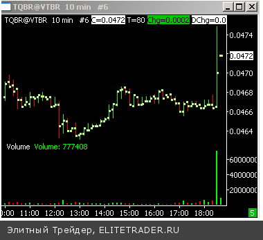 Объемы прошли в последние 15 минут торгов (150 тыс. лотов по 0,071). Видимо, это была точечная сделка через стакан. Маркетмейкер принял объем от западных фондов. Если бы такой объем пошел по рынку, то акцию пришлось бы отмазывать от плинтуса.