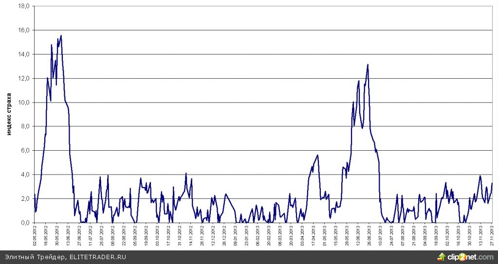 Индекс страха сегодня внутри дня вырастал до максимумов ноября 3,7. Причем добирали за счет спреда между ММВБ и РТС (за счет доллара). Волатильность была ниже той, которая отмечалась 13 ноября. Сейчас индекс — 3,3 пункта: