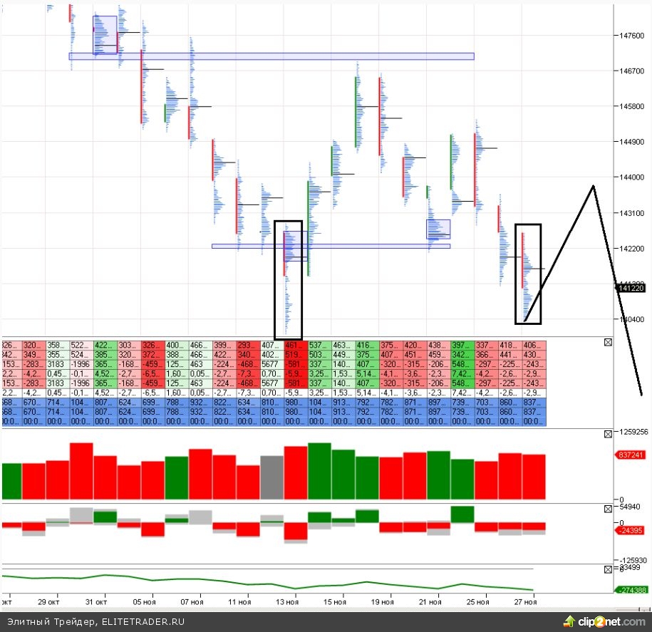 Особое внимание во фьючерсе на индекс РТС обратил внимание на объем, который был набран в районе 141 700 пунктов. Он резко выделяется.