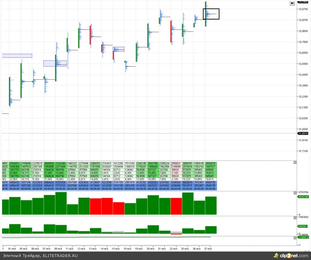 Доллар-рубль (спот). Сегодня собрали объем в районе 33-33,03 руб. почти на 500 млн. долларов США. Причем весьма точечно. Потом вышли импульсно вверх на закрытии дневной сессии.