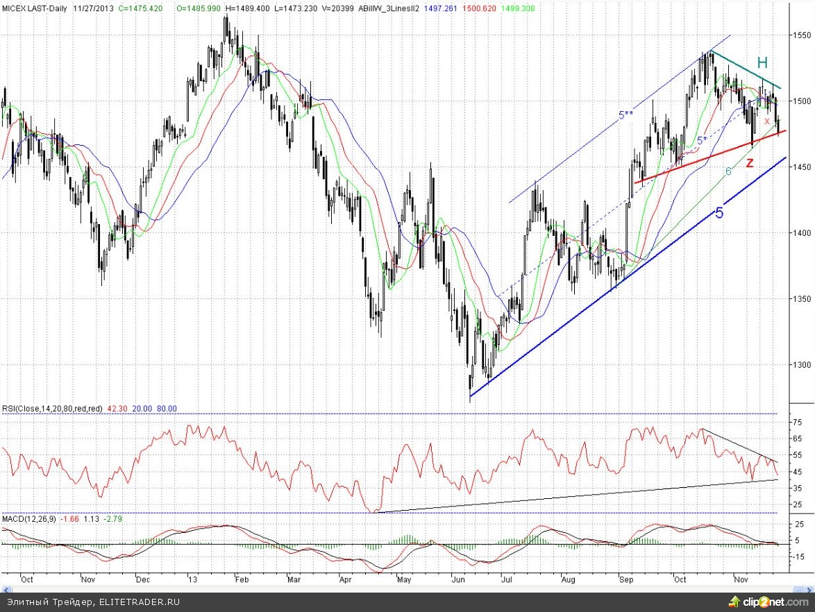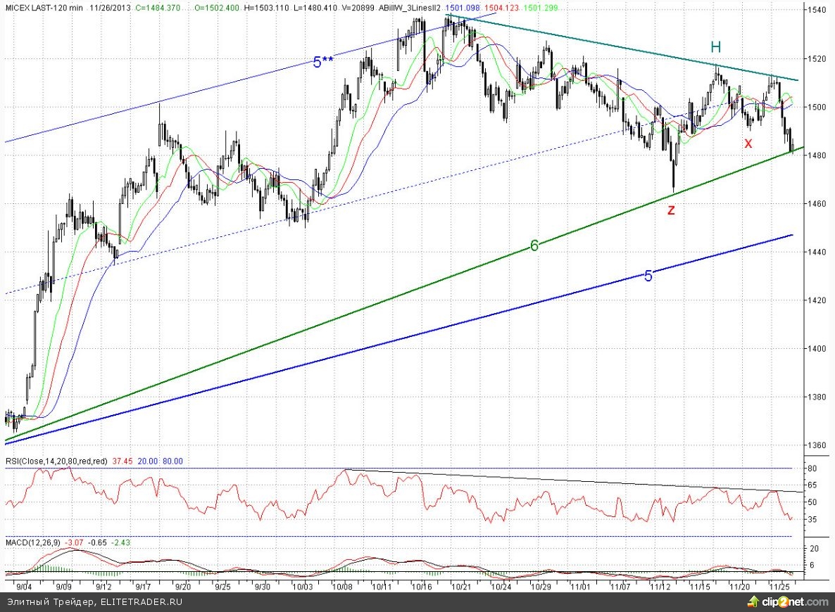 Исследуя 2-часовой график индекса ММВБ. видим, что на умеренно позитивном внешнем фоне открывшись с небольшим гепом вверх, котировки попытались начать формировать отскок. Однако, избитые накануне быки активности проявляли совсем маловато. К тому же сильным сопротивлением выступила бывшая ключевая поддержка в лице дневного фрактала на продажу Х (1 489,98 п.) А после обеда, как только цена на нефть (Brent) начала совсем немножко снижаться от полуторамесячных максимумов, российских бычков словно ветром сдуло, и котировки преодолев среднесрочный растущий тренд (6) обновили минимум вторника, наполовину закрыв «старое» широкое незакрытое окно от 14 ноября. В результате день снова завершился в существенном минусе (0,6%)
