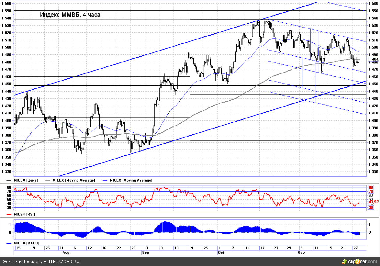 Что касается индекса ММВБ, то взгляд на текущее положение дел пока остается прежним. О перспективах существенного роста можно будет более уверенно рассуждать в случае подъема индекса ММВБ выше отметки 1510п. Ну а в качестве значимого уровня поддержки пока не получается выделить лишь весь диапазон 1440-1460, который выступает широкой зоной торможения, где продавцам оказывается серьезное сопротивление. Кроме того в этом же районе проходит нижняя граница up-тренда с июня этого года (1455).