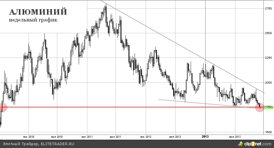 Понедельник начинается снижение цены алюминия на Лондонской бирже на 0.5%, фьючерсы на металл торгуются в данный момент ниже технического уровня $1750 за тонну. Торговая сессия пятницы закрыла месяц снижение котировок металла более чем на 5.5%, показав минимум в районе $1741 за тонну, что стало минимальным значение с лета 2009 года. Таким образом, за неполный 2013 год цена металла снизилась уже на 16%.