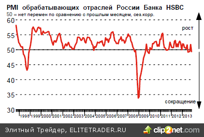 Между тем внешний фон первого дня недели уже сформировался и получился умеренно негативным. Основные российские индексы сейчас теряют чуть более 0,3% на фоне негативных данных по деловой активности в обрабатывающих отраслях страны и снижения нефтяных котировок. В частности по сорту Brent нефть теряет уже более 0,5%, а деловая активность в России неожиданно ушла ниже 50, составив в ноябре 49,4 пункта, что говорит о серьезном ухудшении в данном сегменте. Из компонентов индекса наиболее настораживает снижение числа рабочих мест пятый месяц подряд, а также падение закупочной активности и слабость экспортного спроса при умеренном росте инфляционного давления.