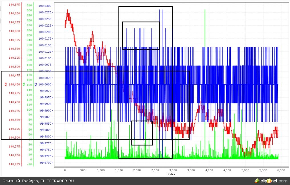 Вот здесь немного препарировал импульс в 13-38, из картинки видно, как на прорыве 140 300 — 140 400 начал работать крупняк (спред (синяя линия) в стакане стал разъезжаться от стандартного), красная линия — цена, зеленая — объемы: