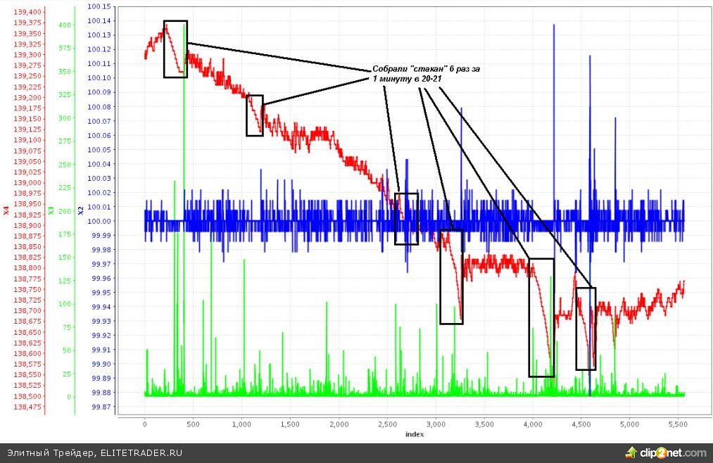 А это минутка в 20-21 сегодня на вечерке более укрупненно (период с 20-21-00 до 20-21-59). За минуту 6 раз собрали стакан (!!!), особенно круто собирали в конце импульса в районе 138 600 пунктов: