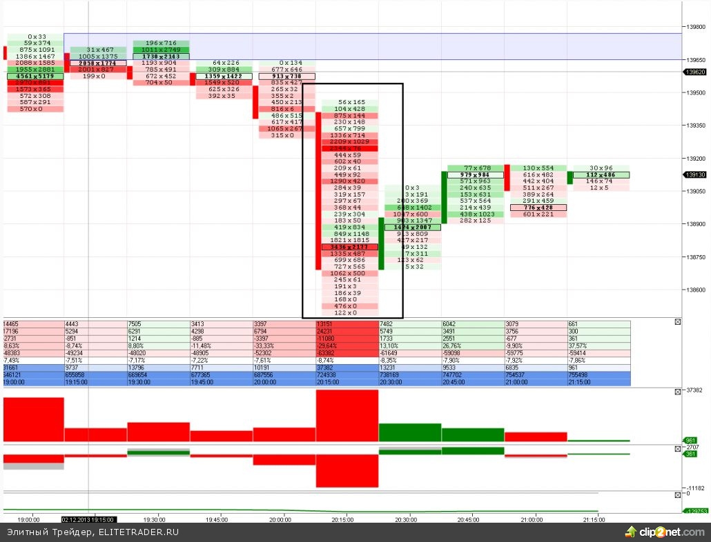 А это микроструктура импульса в 20-21 (870 пунктов вниз за минуту — это круто, 26 ноября за минуту всего 650 прошли), здесь уже 139 200 — 139 350 смотрится как самая активная зона действия крупного игрока, видимо, откат сильно выше уже не дадут, слишком резкий был этот импульс в 20-21: