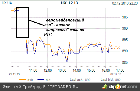 В самом ликвидном фьючерсе Украинской биржи сегодня был аналог российского «кипрского» гэпа, его условно можно назвать «евромайдановский гэп». Открылись гэпом и весь день ползали на минимуме дня. Думаю, там то же продажи продолжатся. Слишком одиозный получился гэп. Конечно, могут для приличия немного отскочить. Но, в целом, наверное, Украина будет сильно ниже текущих: