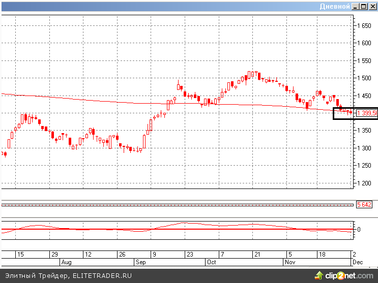 Видимо, это пока не предел — 26-я волатильность Увидим на этой неделе и выше. Спред между ММВБ и РТС разросся до 73 пунктов. Усиление продаж на споте может наступить уже в ближайшие дни. Естественно, речь про 1,5-2% движения по индексам. Одним словом, сегодняшний день показал, что бумаги на споте будут ниже. Главный вопрос сейчас, перерастет ли это в серьезную тенденцию или ограничится локальным продавливанием до 1440-1450 по ММВб и с последующим резким выкупом?