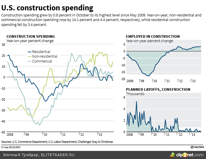 Сильные данные по расходам на строительство за октябрь можно отнести все к тем же опасениям сокращения покупок ФРС. Аналитики ожидали роста на 0,4%, тогда как отчет указал на 0,8% на фоне неожиданного роста расходов на строительство общественных зданий. Расходы федерального правительства в октябре выросли на 10,9%, показав самый значительный месячный рост с января 2011 года.