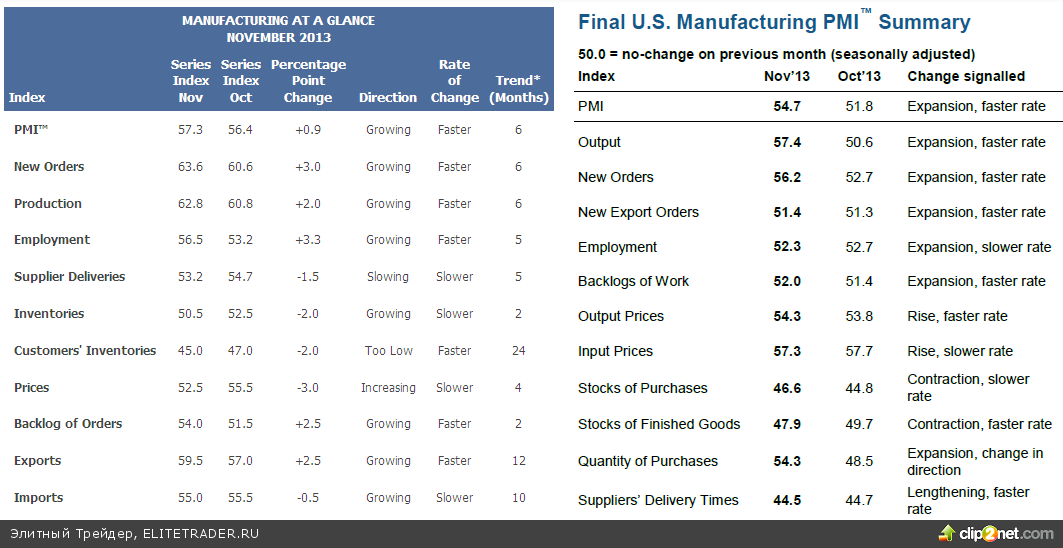 Отчет ISM за ноябрь указал на рост деловой активности в производственном секторе до максимума за 2,5 года, составив 57,3 пункта, тогда как аналитики ожидали снижения до 55 пунктов. Глава Института управления поставками (ISM) Брэдли Холкомб заявил, что среднее PMI для января-ноября (53,7) соответствует увеличению реального ВВП на 3,6% в годовом исчислении.Из 18 отраслей промышленности 15 сообщили о росте. Существенно увеличились подиндексы новых заказов и занятости.