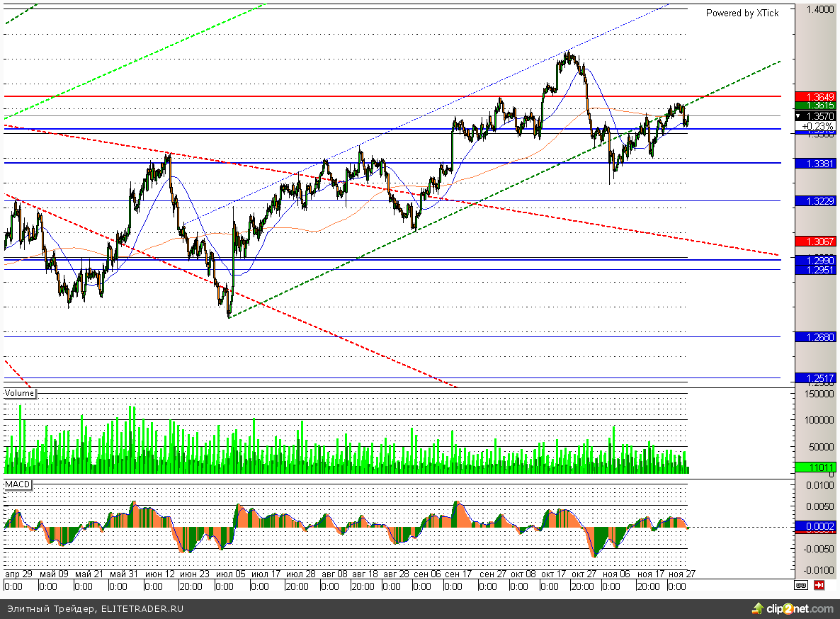 Евро котируется на уровне 1.3540, минимальный уровень сегодня был зафиксирован на 1.3520. Изменение отношения к доллару на этой неделе заставляет крупных участников избавляться от части своих евро-позиций. С минимальных отметок ноября на 1.3300 единая валюта максимально прибавляла до 320 пунктов, а сейчас величина прироста составляет 250 пунктов, что все еще выглядит привлекательно для фиксации прибыли. Краткосрочный спрос на евро может появиться на отметке 1.3500.