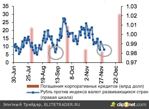 Слабость российской валюты в ноябре стала результатом комбинации нескольких факторов. Отток капитала из фондов, ориентированных на отечественный фондовый рынок, замедление деловой активности и рост спроса на иностранную валюту в преддверии пика выплат по долгам российских эмитентов усугублялся увеличением рублевого предложения в связи с необходимостью выполнения бюджетных показателей. Однако к концу года «деревянный» вполне способен отыграть часть потерь.