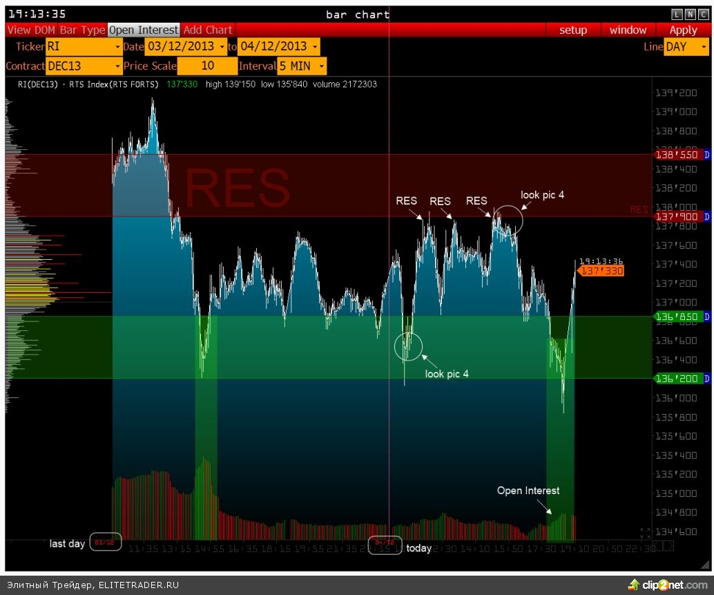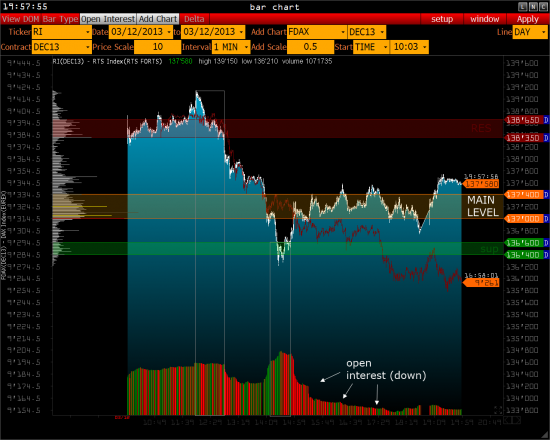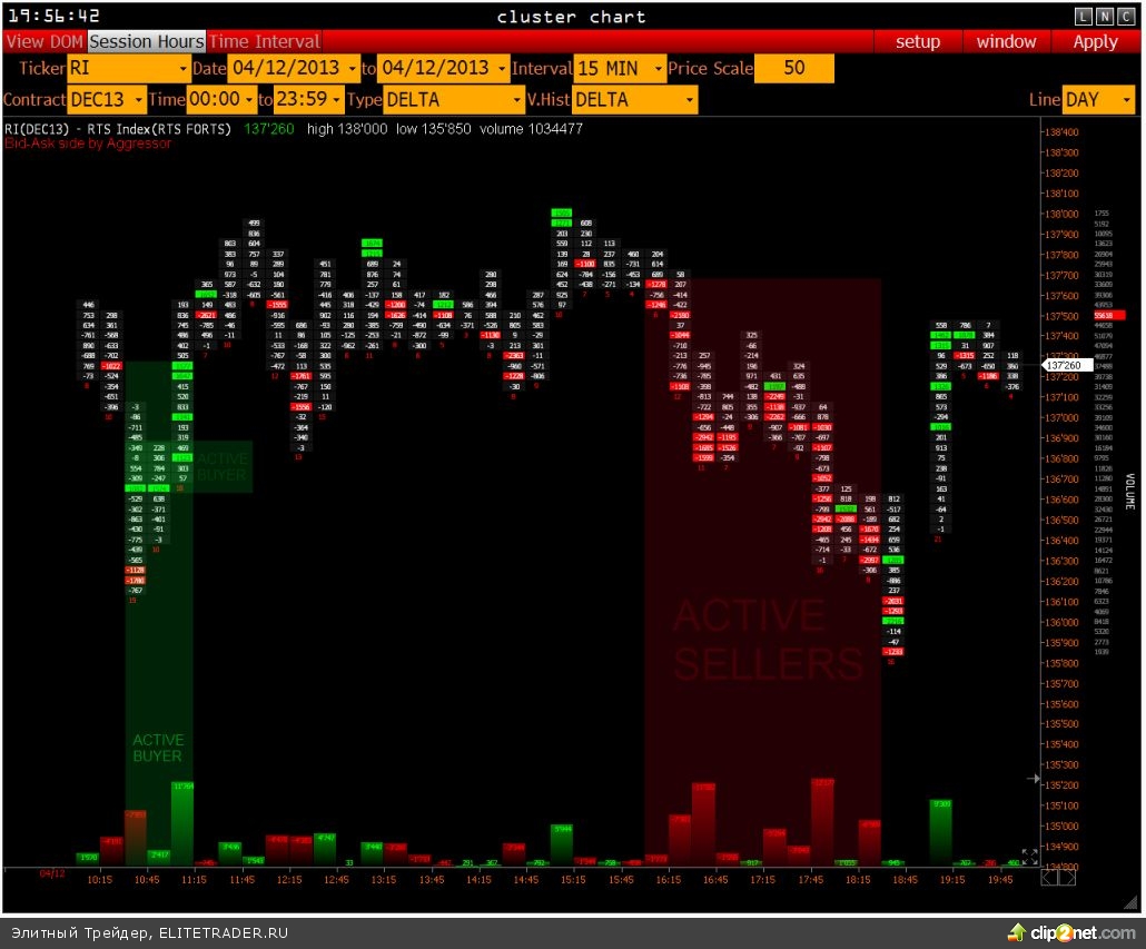 Теперь обратим внимание на то, как сегодня себя вел индекс РТС. Обратите внимание ( слайд#1 ) на точку реверса в районе 136400 136600, на сколько там сильно выросла активность по сравнению с остальными участками. Возьмем его на заметку в качестве поддержки, и будет мониторить на предмет защиты.
