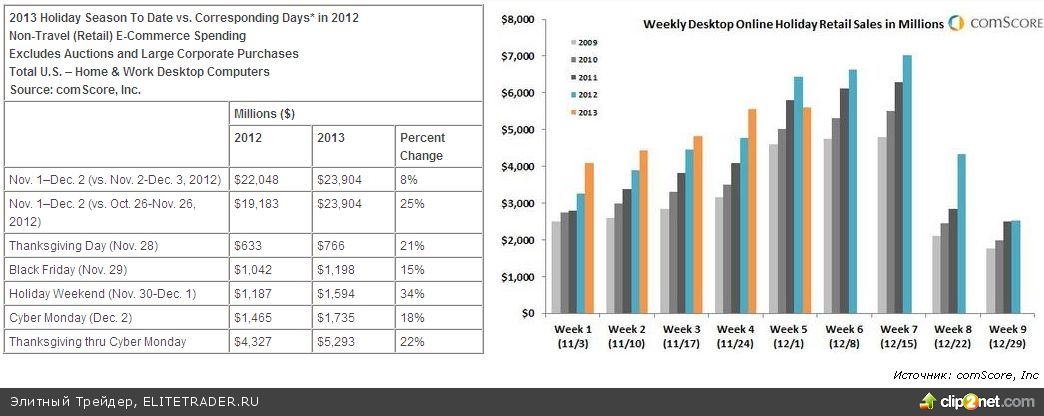 В то же время исследование онлайн-продаж организацией comScore указывают на существенный рост за праздничный период на 22% $5,3 млрд. Непосредственно в киберпонедельник рост составил 18% до $1,74 млрд. При этом диаграмма обнародованная в отчете с разбивкой по неделям, указывает на то, что в совокупности за 5 неделю сезона ноябрь-декабрь, в которую включались все ранее упомянутые выходные, объем продаж не дотянул не только до прошлогодних уровней, но и до уровней 2011 года.