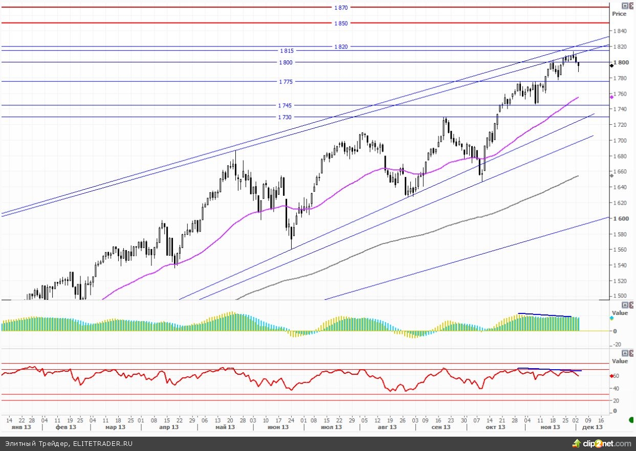 Пока все развивается в рамках описанного ранее сценария, поэтому лишь повторю, что несмотря на то, что все трендовые индикаторы продолжают смотреть наверх, сейчас появляются достаточно большие шансы на то, чтобы все-таки начать рисовать долгожданную коррекцию. Достижение и отражение от целевого сопротивления (1810) дает робкий сигнал о локальной слабости покупателей. Осцилляторы на 4-чаосовм таймфрейме также сигналят о наличии разворотной медвежьей дивергенции (на MACD и RSI).