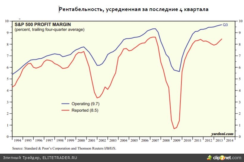 Данный график иллюстрирует рекордные значения по рентабельности, которые компании достигли благодаря сильному сокращению расходов, включая сокращения рабочей силы. Поэтому мы и наблюдаем рост прибылей при слабой выручке за счет улучшения рентабельности. Поскольку сложно улучшать рентабельность без роста производительности труда, то при слабых темпах роста выручки и относительного потолка рентабельности в будущих периодах будет невозможно значительно улучшить рост прибылей, что должно сказываться на росте капитализации рынка.
