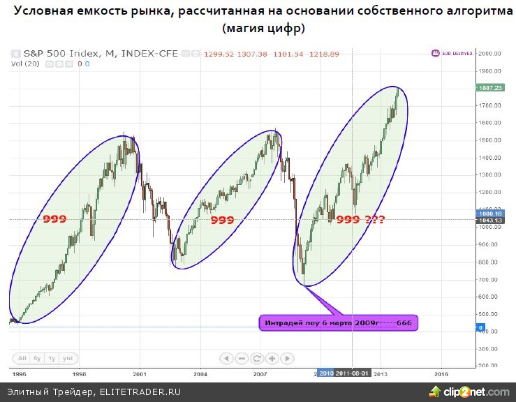 Некоторые расчеты позволили определить, сколько рынок «проглотил» в периоды существенного роста. Оказываетсяусловная величина 999 характерна была периоду 90-х годов прошлого века перед формированием пика, далее то же значение от низа 2002 г. до пика 2007 г. и сейчас практически близко к 999, погрешность порядка 5%7%.